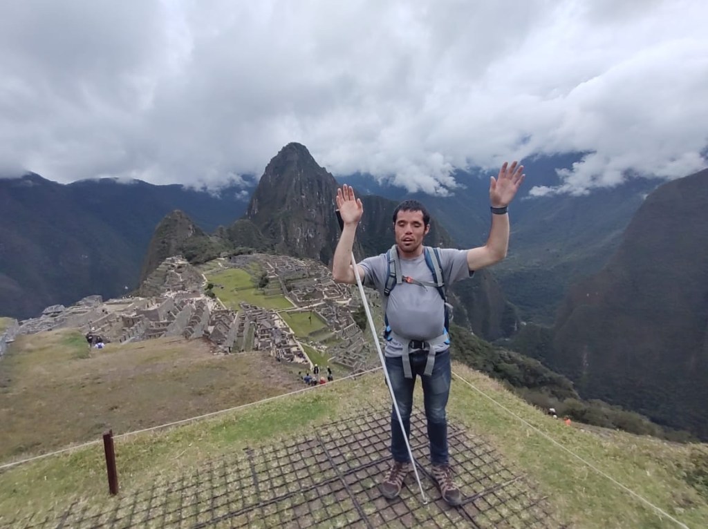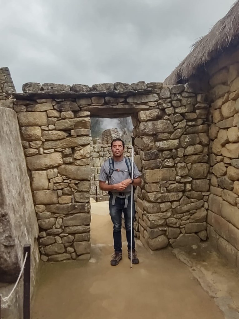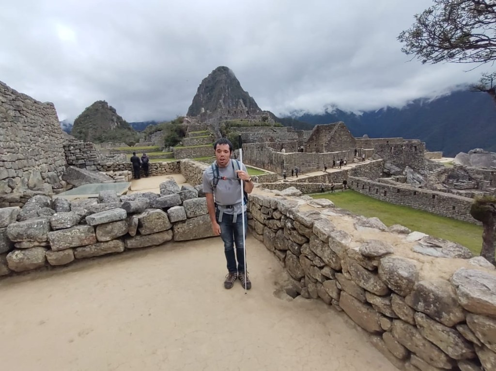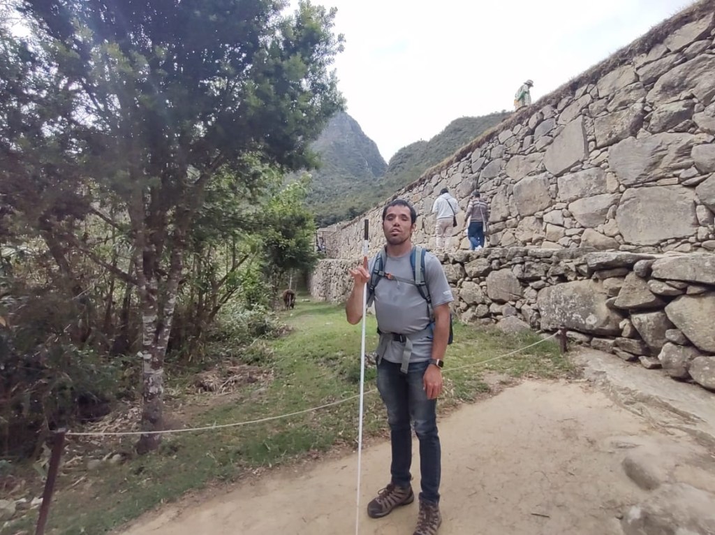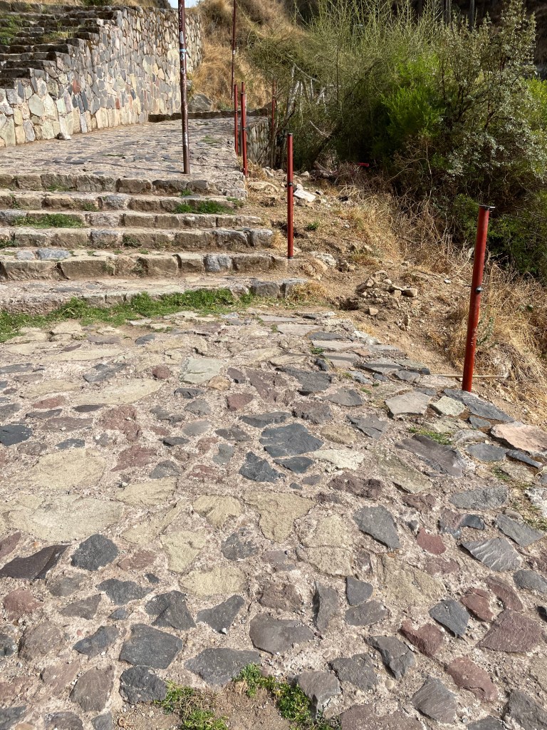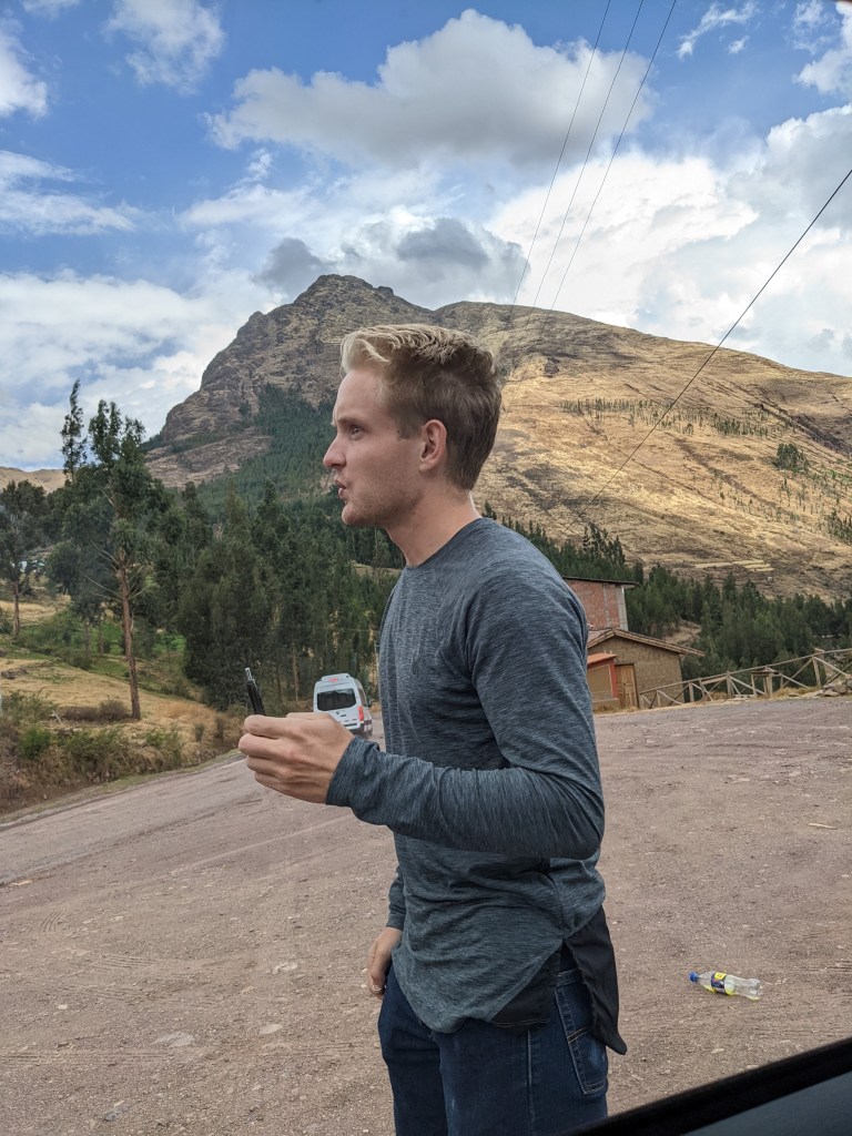 Machu Picchu the next morning was, to be honest, a lot of information all at once, and my questions were either lost in the tide of information or were met with, “Let me finish my speech.” I was given a book recommendation from which I hope I can refresh my memory, because I came here to learn as much as I could about this Inca citadel, not just to be there. What I do remember is that there is an agricultural center, a religious center, and an urban center, and they all face east toward the sun, which they worshipped. Ever COVID, Peru’s Minister of Culture decided to rope Machu Picchu off into sections. My circuit only included the urban center, which was still cool. The most memorable place in that center for me was the emperor’s house. The streets are even narrower than those in Cuzco, such that only one or two at a time could pass. The chacana is an important symbol in their culture that represents a bridge between their three worlds. The upper world is ruled by the condor; the underworld is ruled by the snake; and–I really hope I get this right!–the middle world is ruled by the fox. Machu Picchu has many levels. It’s unfortunate that we didn’t get to see all of them, but it was another step back into antiquity. Eduardo took many pictures of me and the surroundings; then we went to the outskirts of the city for my classic picture. Walking into the city, there was originally one platform, and on special occasions one would stand on this platform and participate in the ceremony of purification, a part of which included a naturally growing hallucinogen called, in English, the trumpet angel. As intrigued as I am by natural psychedelics, I didn’t give that plant a try. Eduardo also told me about this other place, whose name I know but won’t bother to spell for now, that is like Machu Picchu but with many more platforms with more elaborate designs.