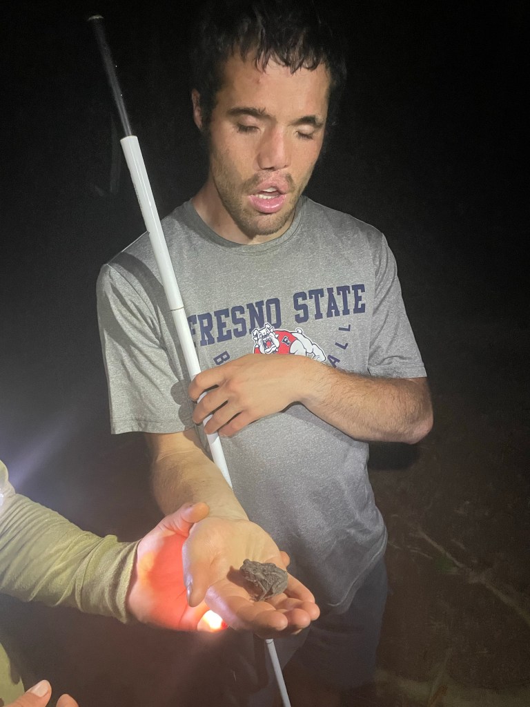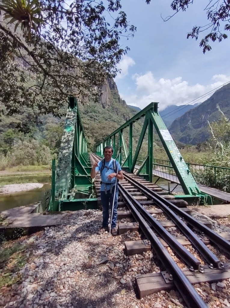 He and I also learned a lot about how to work together. He learned that I wasn’t the helpless hop-along he had apparently been told to anticipate but an adventurous type who did things that terrified, then impressed him, such as making precarious stream crossings over rail lines. In fact, at one point he said, “I think you’re lying to me, man. The way you react to things in the path, I think you can see.”