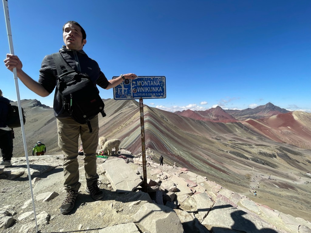 I don’t know why I had waited as long as I did to hike Rainbow Mountain, because the mountains are always such a refreshment to me, possibly rivaled only by Lake Titicaca (more on that in the future, too). I found a really good tour through Peru Hop (for anyone going to Peru, I would ten out of ten recommend Peru Hop for everything from price to security to authenticity). They don’t go everywhere in Peru, but I imagine that for the places they don’t go they can help you find the best experience). We left early in the morning and ate at a restaurant. Breakfast in the Peruvian Andes is pretty good, if often basic, consisting of quinoa, bread, sometimes fruit, and a variety of teas or mattes. Afterwards, we hit the road again. At the base of the mountain, one of the guides, Ivan, tried to convince me to ride a horse because this would mitigate the effects of altitude, but I insisted on walking, and I did pretty well. Along the way up, Ivan taught me a few phrases in Quechua, such as those for “good morning,” “let’s go,” “brother,” and “person”. The mountain is a different world. We were one of the first groups on the mountain, so the silence was supreme, divine. At the top, and really only at the top, I could feel the altitude. Before I came to Peru, I could run five kilometers with little effort. Here, even some little things took conscious effort. Running five kilometers–forget it. I also got to touch a llama and an alpaca for the first time.