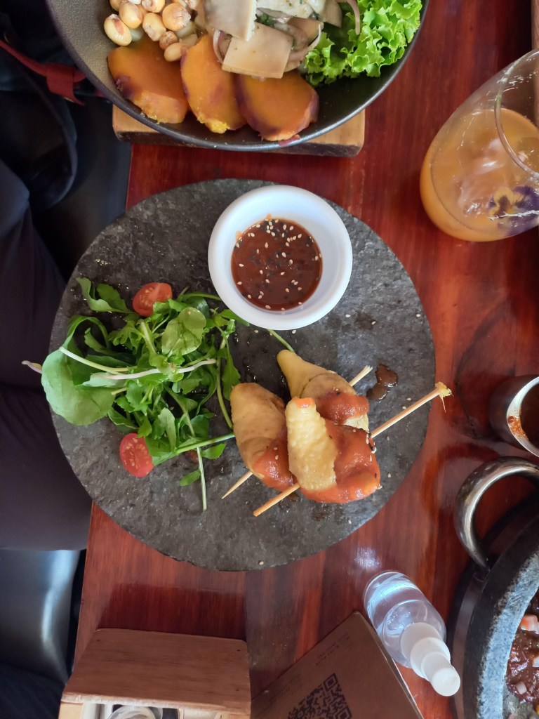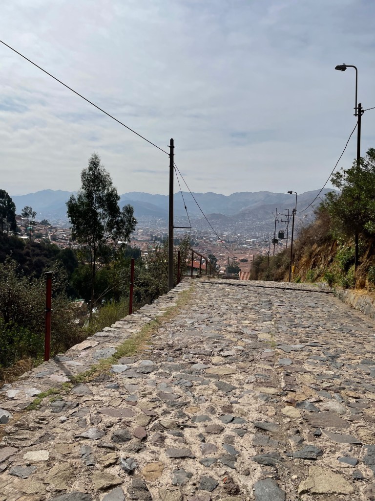 After an hour’s searching and following different directions, I next arrived at the lookout of the Cristo Blanco statue, but I didn’t take any pictures because I was near more people this time. Not long after, I turned around and headed back. At one point I was redirected because there was construction on a big bridge, and the area around it was a mess. I was grateful for the help. The person who redirected me was a member of a locally famous band who performed a fusion of salsa and chicha cumbia, Peruvian cumbia. He was cool. From there I took many hundreds of steps down into the city and from there headed back toward home to meet my Spanish professor for lunch. We ate some delicious traditional Andean food. I had fried guinea pig–I can’t remember what she had.