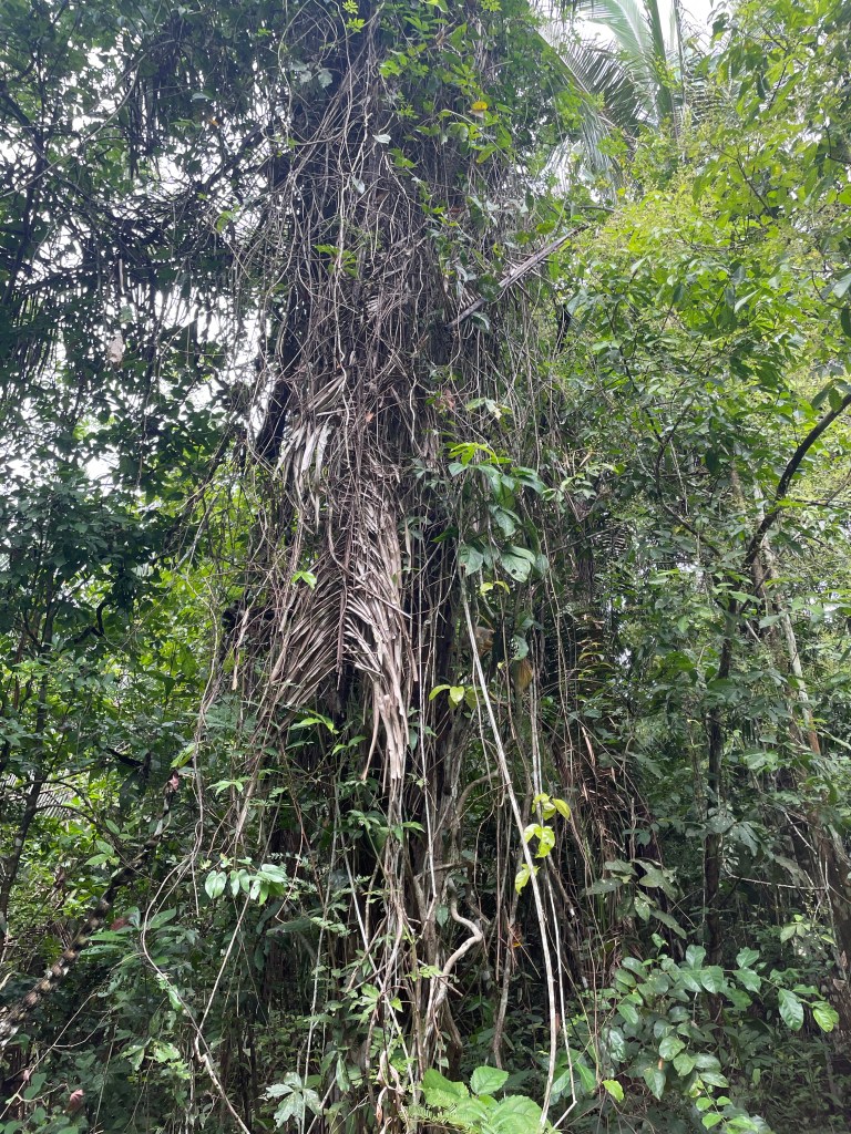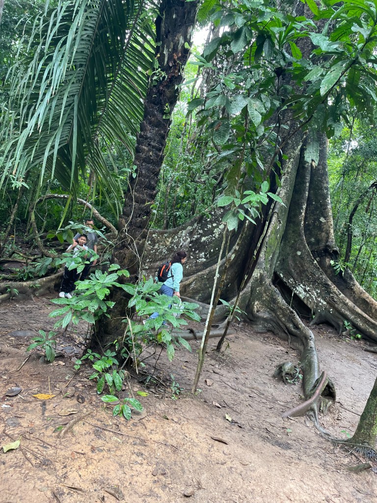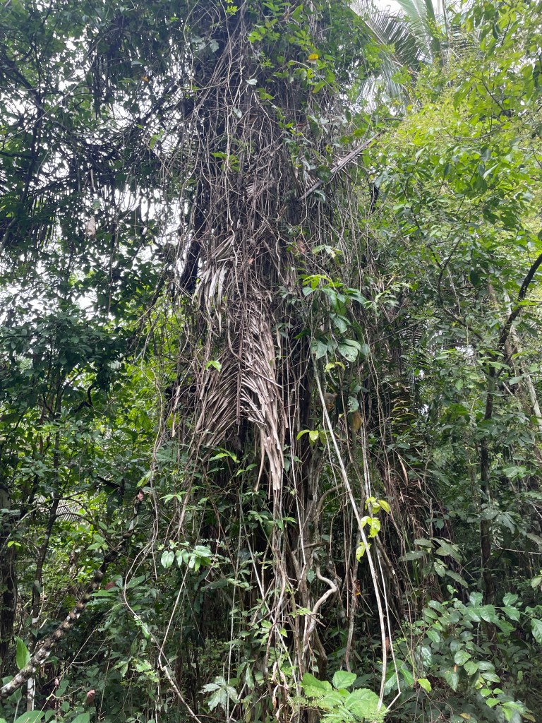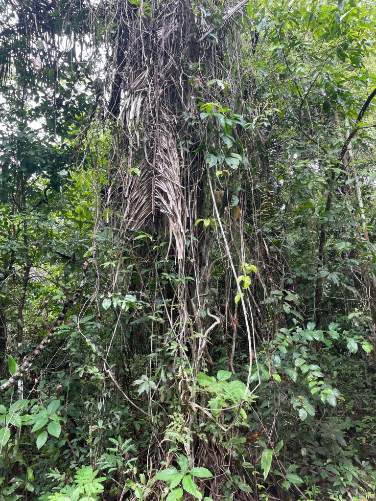 Monday was our last day here. After breakfast, after I had to strongly insist to my guide and the other person that I in fact could and should be a part of the group and not off on my own with the private guide, we set off on a sweaty, sticky, wet, tangled, wonderful hike. As much as I appreciated my guide’s elaborate explanation of what was around us, I also just wanted to be in it, and so I managed to a great degree to block out people around me and just bask in everything I could hear and smell and see and feel–the sunlight filtering through the canopy, sometimes no light at all, and even the bugs (I had started out virtually untouchable this morning by virtue of my repellent, but by the afternoon that was no more). For those who know me, you know that hiking is one of my favorite things to do, and some of you, if you are reading this,  will remember going on hikes as a group of us once a month on weekends throughout this past summer (we met weekly during the evenings throughout the fall and spring semesters). You might be thinking, as some people have commented to me, “Man, I wish I were there.” As we hiked around deep in this beautiful, exotic world, I started to think about the things I miss about home, because the end is close, and to be honest, I miss being able to share experiences with familiar people more than anything else. It’s cool to pick up acquaintances on the fly, but seriously, I thought about how much I wished I were sharing this with people with whom I’ve done things like this on a regular basis, where I don’t have to explain myself from scratch every single time, where we can just be ourselves. So, to flip the switch, in that fanciful moment I dearly wished you were there, all logistics satisfied.